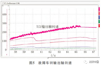 TCU_outputshaftspeed曲线锯齿振荡严重, 急加速工况下点火线圈能够对TCU_outputshaftspeed信号产生严重的电磁干扰并影响TCU换挡判断。图5、图6所示分别为故障车辆输出轴转速与正常车辆输出轴转速。将变速器信号线束随意捆扎, 无防屏蔽需求改为双绞线形式, 输入轴转速和输出轴转速信号无振荡, 试车无顿挫现象。